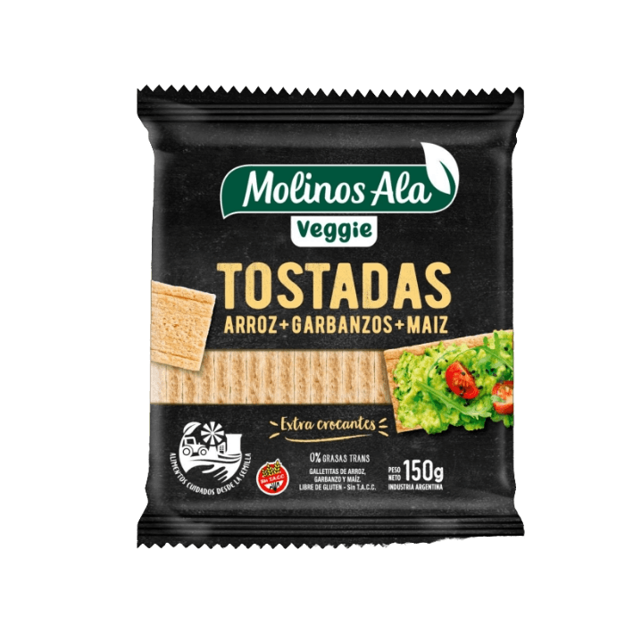 Tostadas a base de harina de arroz, harina de garbanzos, almidón de maíz, azúcar, soja, leche. SIN TACC.